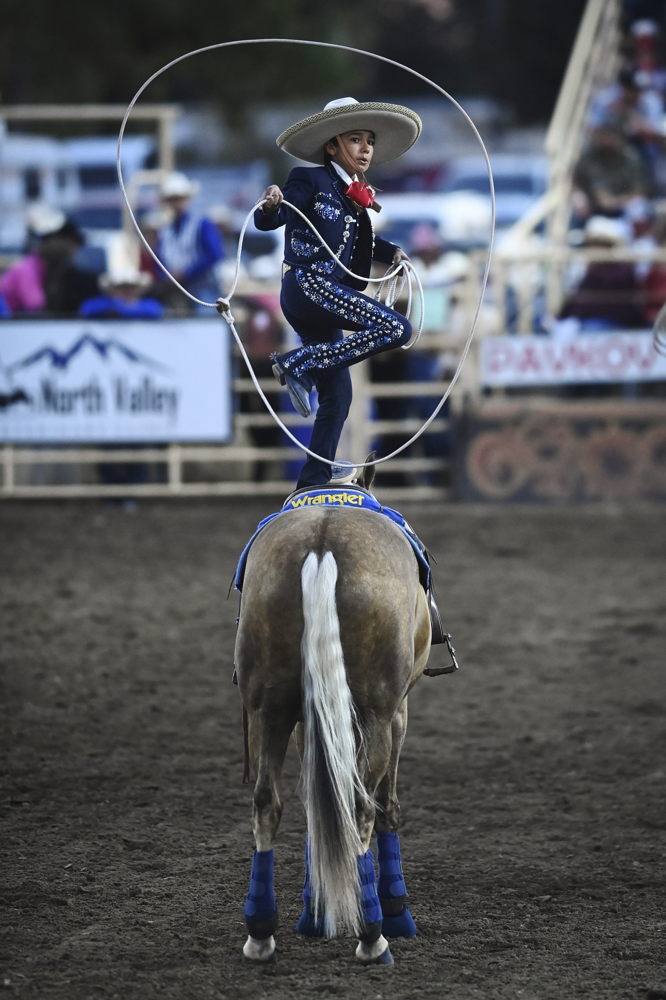 Trick-roper Louis Garcilazo jumps through his lasso while atop his horse at the Gooding Pro Rodeo on Thursday night, Aug. 14, 2025, at the Gooding County Fairgrounds in Idaho.