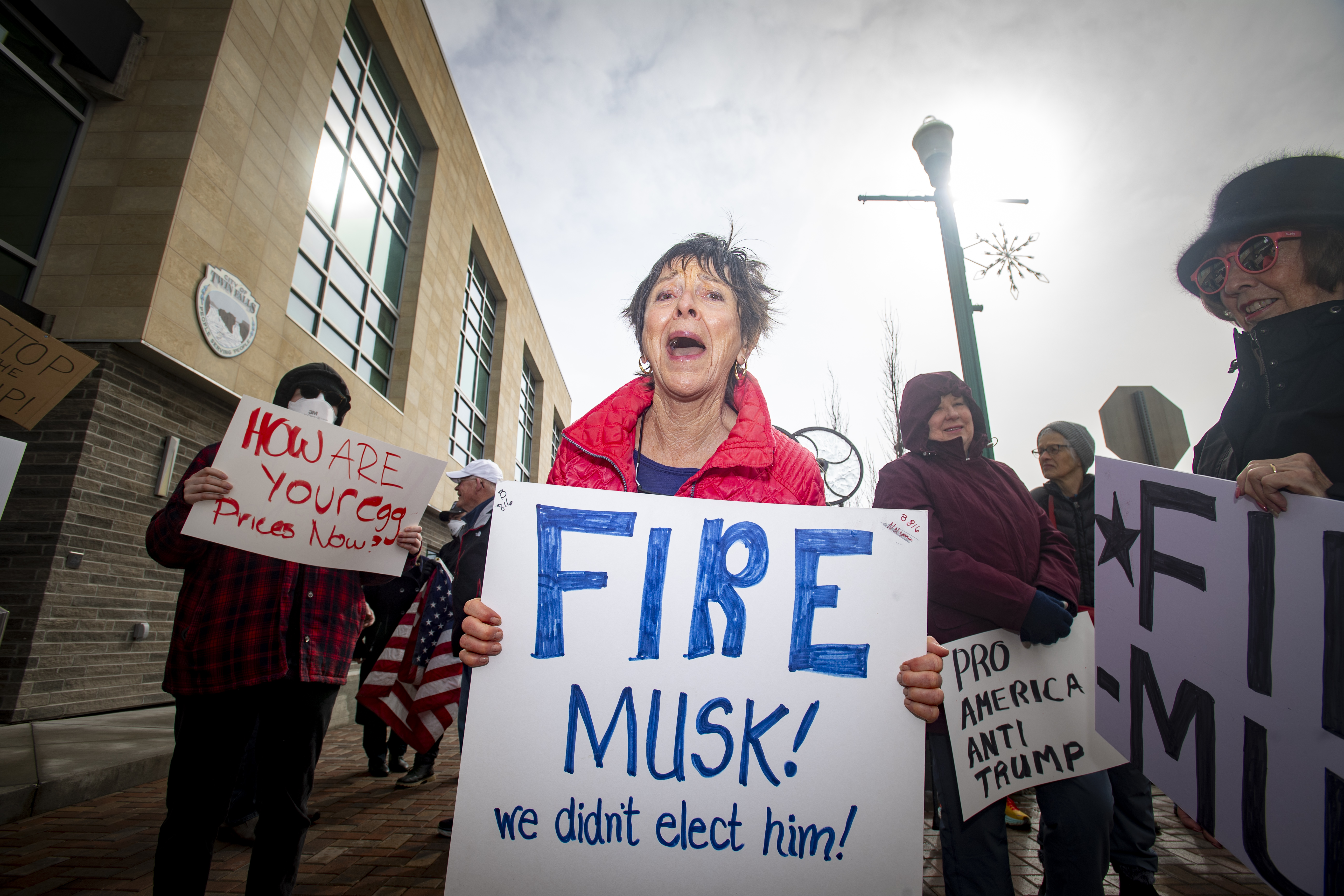 Jan Mittleider holds up her sign along with other protesters during a rally Monday, Feb. 17, 2025, in downtown Twin Falls, Idaho.